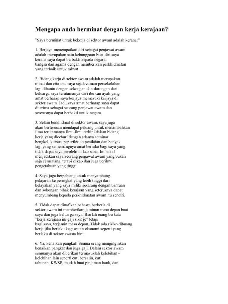 1 kenapa kami perlu mengambil anda bekerja. 2 Saya memang minat kerja kerajaan sejak kecil lagi. Cara kerjanya yang sangat profesional dan teratur menjadi inspirasi buat saya.
